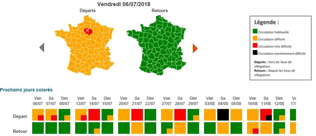 On note une circulation noire pour les samedis 4 et 11 août. Un conseil, privilégiez un départ tôt le matin, ou en semaine !