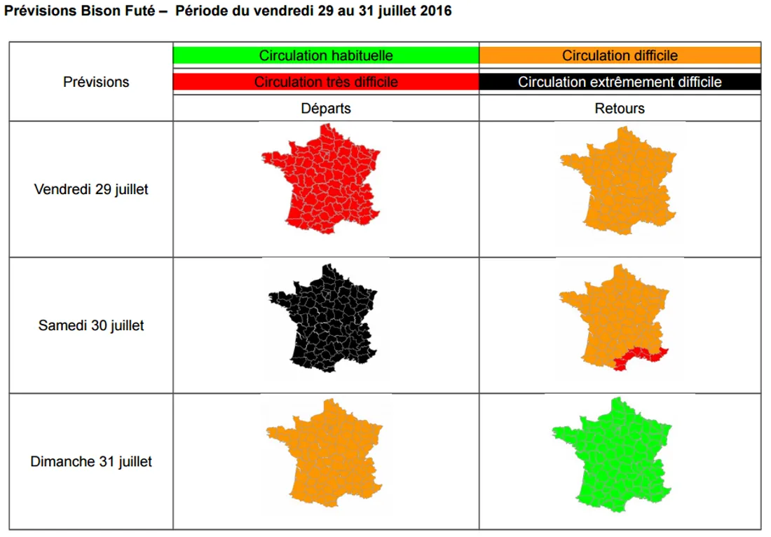 Attention au fameux chassé-croisé ce week-end. Juilletistes et aoûtiens risquent de se retrouver dans les bouchons dès ce vendredi. Bison Futé voit même noire pour la journée de samedi dans le sens des départs. Les bouchons devraient débuter dès 4h du matin ce samedi 30 juillet. Bison Futé recommande de rouler dans la nuit de vendredi à samedi ou d'attendre dimanche partir.