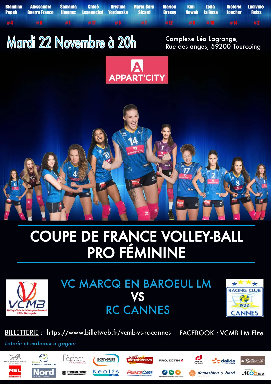 Le mardi 22 novembre à 20h, le Volley Club Marcq-en-Baroeul va tenter d'écrire une nouvelle page de son histoire. Les Louves marcquoises reçoivent au premier tour de la Coupe de France la grande équipe du RC Cannes, multiple championne de France et d'Europe. Un événement qui se tiendra au Complexe Léo Lagrange de Tourcoing, l'antre du TLM qui prête sa salle pour l'occasion. Envie d'aller encourager le VCMB face à l'ogre cannois ?