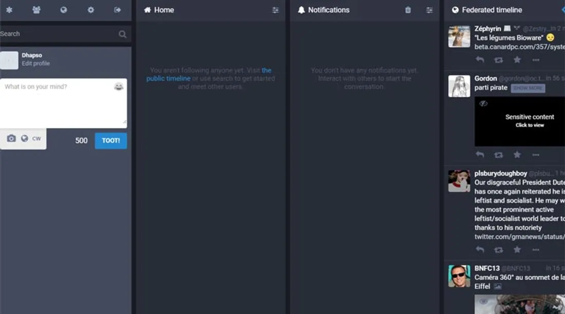 Les fameux « pouets » sont limités à 500 caractères contre 140 sur Twitter. En plus, il n’y a pas de pub ! Mais la grande différence, c’est que Mastodon propose un système libre et décentralisé.